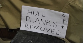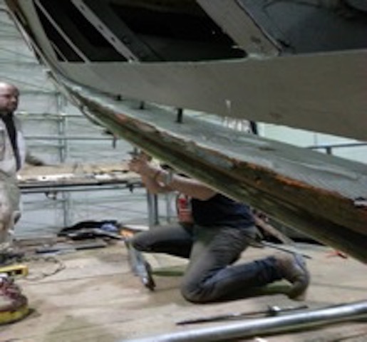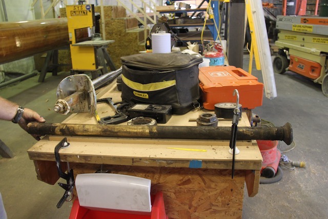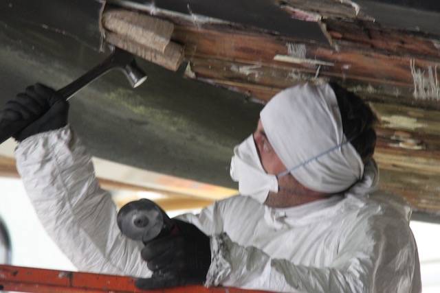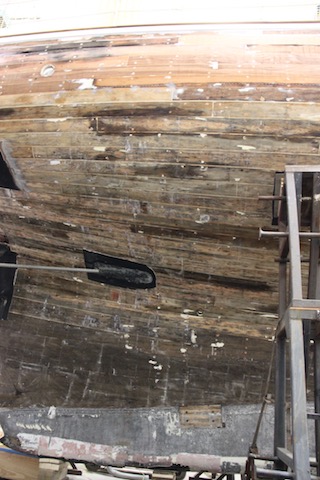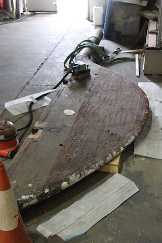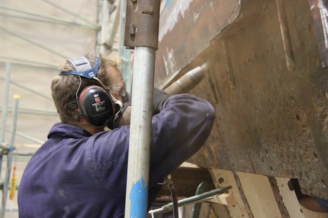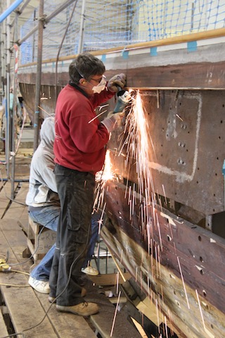Barry Argent, the lead shipwright from SYS, started removing the teak stem in order to expose the steel keel plate underneath which was the concern.