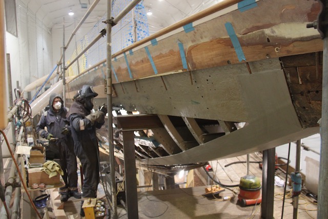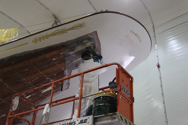 Once we got Cambria into the Ably Shed at SYS the priority was to get the glass sheathing off her hull to allow her to dry out and inspect what lay beneath. We started this operation using scissor lifts for access around the hull rather than having to reset the scaffold staging. We found cutting the glass with oscillators then using wooden wedges the best method for glass removal below water line whilst above water line, particularly due to the awl grip paint and the fact the glass was ‘firmly’ fixed to the mahogany, the team from Centerline used Gel peelers. These are essentially modified electric planers, which can operate on curved surface. The aim was to only remove the glass and not damage the wood below too much as this would lead to more fairing later and result in further loss of plank thickness. For the following 3.5 weeks there was a steady screaming noise emanating from the shed as 4 guys ground off 130 square meters of Cambria topsides.