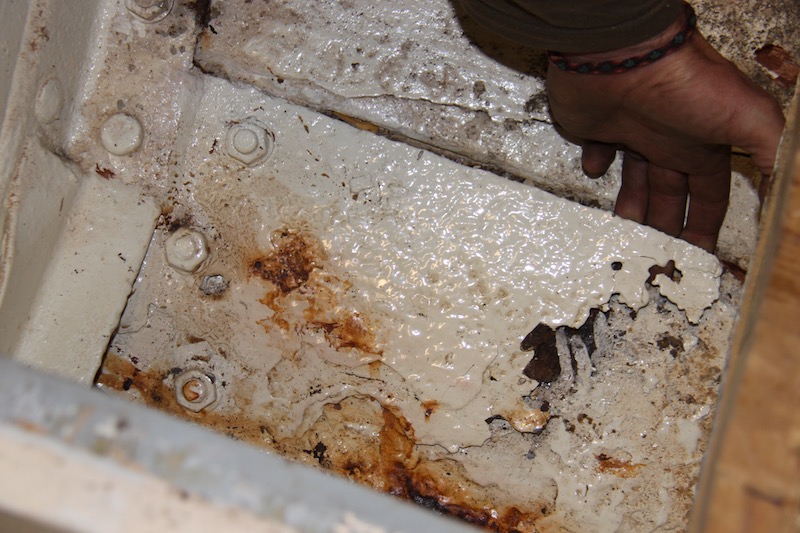 The joint between sternpost wooden keel, the lowest point for water to collect under the fibre glass and potentially a major game changer, was for an 86 year old, dry. This was a massive relief, though we had allowed for all eventualities; even securing a log of Doussie in case we needed to make repairs along Cambria’s backbone. She was sound. We did not need to remove the keel and we could concentrate on the known issues.