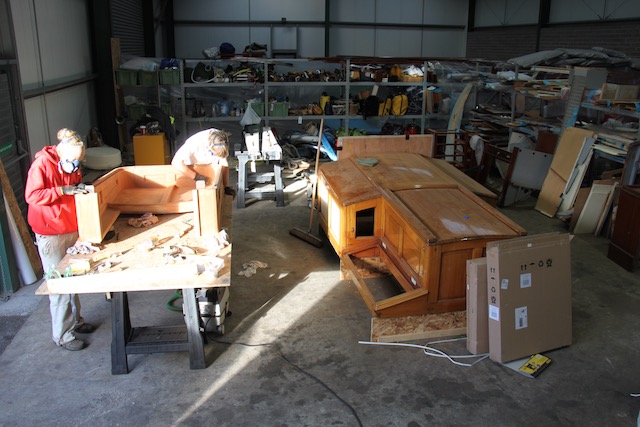 By early October we had two distinct areas of work, the Ably shed with Cambria’s hull works and the strip club with the interior and deck furniture works. We would all meet at lunch and then return to each other’s place of work. Tash kept everyone’s spirits high with fantastic food she’d prepare each morning and then ferry in for us, no one went hungry.