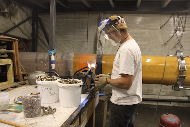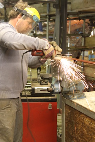 Dave took to helping Bob with the steel work, and after a quick lesson in bending steel plate, he was soon fabricating butt plates for the plankers. These are the steel plates which are used for joining plank ends between frames.
