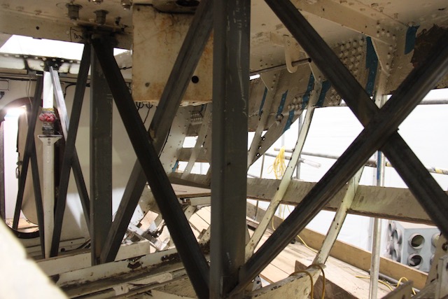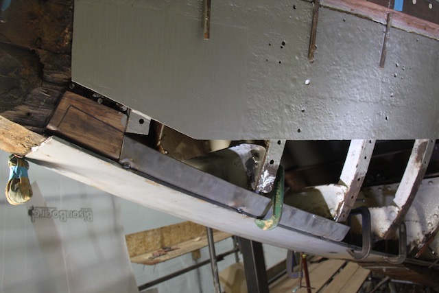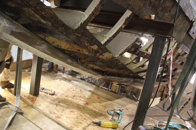 Before the timber stem could be removed it was necessary to support the bow more substantially. By removing the planking at the bow and then the timber stem and the steel longitudinal, the remainder of the bow would only be supported by the deck tying the frames together. The potential for deformation was obvious, so Barry and his team built steel legs (the “goal posts”), which provided direct support from the deck to the floor of the shed. A series of angle supports were then welded along the centerline through the forepeak to provide further rigidity.