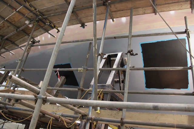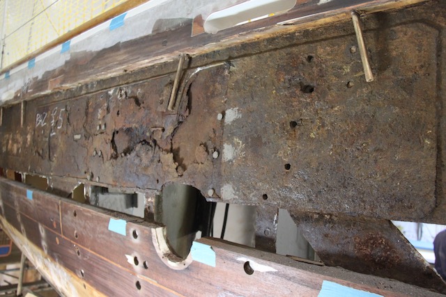 Whilst Barry and Jim removed the stem to access the steel work inside, the welders made repairs to the sheer plate, cutting out wasted area and making good and also filling old chain plate fastenings no longer required.