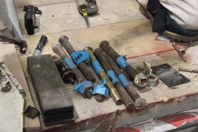 By this stage; early October, 3 keel bolts had also been drawn and sent off for x-raying. Removing and testing the keel bolts had to be well organized as keel blocks had to be moved to access the bolts, so once bolts had been out and tested, they were replaced and reblocked as soon as possible to reduce the risk of keel movement and allow the next bolt to be removed and inspected. Removing the keel bolts firstly required locating and removing the nuts then jacking the bolt back up into the bilge. The bolts are 2 inch (50mm) diameter and 4 foot long (1200mm) with domed heads and washers with a tapered washer/nut.