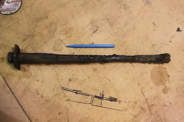 To remove the stem, a number of large through fasteners had to be removed. The fastenings of the stem to keel plate were all bronze bolts and in excellent condition, the longer through fasteners from stem to deck were however steel, these three upset head fastenings were heavily corroded and in need of replacement. A strange choice of fastening for this area, though they had easily achieved their spec of 18 years, we replaced them with bronze fastenings of the same scantlings.