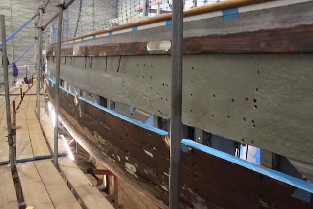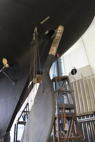 The aim of this refit was: to treat corroded steel along the forefoot and stern post; draw and inspect a number of random keel bolts; remove and inspect the rudder, steering gear, bowsprit and head gear; and inspect the stainless steel fastenings.