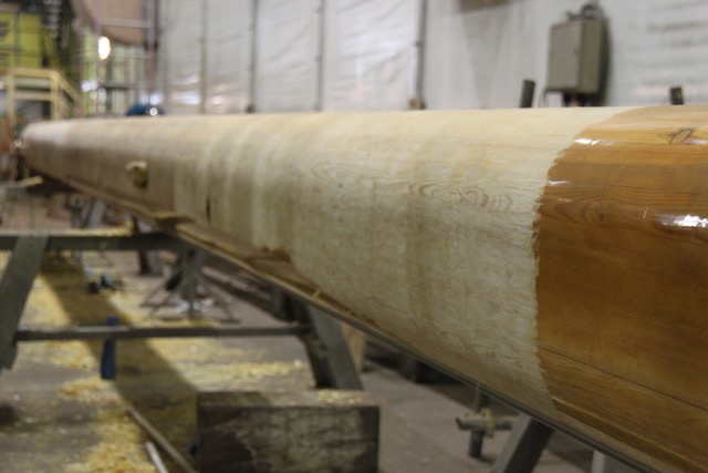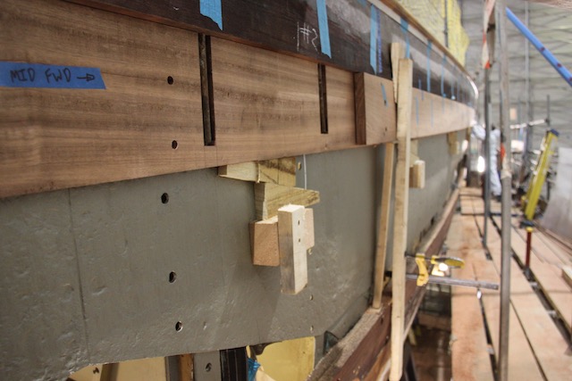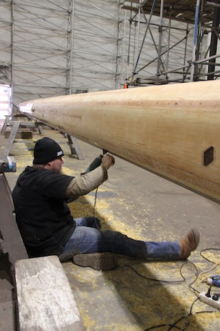 Though March had started positively we suffered a number of staffing set backs losing one of our plankers, Kevin, to epoxy intolerance, Chuck back to NZ with other work commitments and John Garret down with Pneumonia. Epoxy intolerance can happen to anybody at any time, and everyone has different reactions to it. Though Kevin had worked with epoxy many times and used the PPE, he had reached his limit. When this happens you cannot be around epoxy without breaking out in a rash. Sadly for Kevin, and us he had to leave the project and we were again short numbers. Johnny who had been with us since day one was also a major loss at this time and we could only wish him a speedy recovery. SYS and Centerline both did their best to supplement shipwrights but there is not an endless supply, particularly at this time of year when the marine industry is flat out getting all projects ready for the season fast approaching. It meant longer hours for all to keep pushing for the goal of October launch. Here again SYS came to help by allowing us to work on planking often until 2000hrs in the evening. It was always important to finish the day with and gluing projects so that they would be ready for installation or shaping the next day.