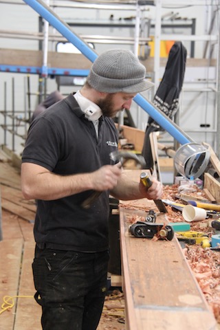 The culmination of a busy planking period saw the ‘goal posts’ removed. These had supported the bow whilst the structural work in the area was carried out. With the bow planking complete, Cambria’s forward structure had returned to Lloyds 18A level. With the ‘goal posts’ out the bow could be completely closed up. This occurred on the 1st of May and by the 8th of May shutter planks were installed both sides. With all planks complete from mast forward we could reallocate tasks setting up teams for caulking and splining to follow the fastening and plugging teams. Moving shipwrights John Bray and Sam Fletcher aft to finish planking over recently completed steel works by way of the sternpost and horn timber. As these teams moved aft it cleared the way for the hull to be faired using power planners.