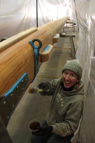 Cambria’s mast and boom were lying next to her hull and would also receive attention. The mast was last out during the 08/09 refit, and it is prudent to have a wooden mast out for inspection every five years. Firstly, all of the fittings including spreader ends were removed and red lead paint was reapplied where necessary. The fittings were then beaded down with white lead putty. The same process we had used when we built the mast in 06 which had protected the timber perfectly. In January the stripping and sanding started. The boom, which is varnished, was first then the mast, which is oiled. We needed to leave the oiling process until the temperature started to climb. Once the boom was stripped and sanded a tent was built over the 18m long spar ready for varnishing. Remembering the works going on next to and above – the tent was vital! The varnishing regime was as follows: sand down to 220 grit; then a 50/50 coat was applied to seal the timber, eight coats of wood finish was then applied (which reduces the sanding between coats) for build up, two topcoats of single part Epifanes then finished off the job. All varnish work followed this regime so we could keep track of the finished colour.