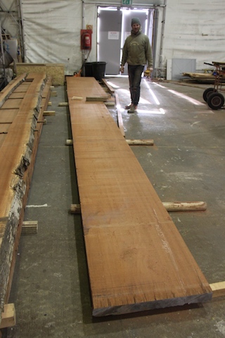 Our longtime friend John Lammerts Van Beuren and his company Touchwoods BV, who helps source and supply all of Cambria’s timber requirements, came up with the lengths of clean, dry sipo. John has been involved with Cambria since the building the mast back in 2006. With his help and expertise we had planned all the timber needs for the project. This had taken a number of years to find the right stock of not only timbers such as Mahogany and Doussie but also the teak, which again through John’s help we sourced via Boogaerdt’s in Holland. The teak, 23 live edge boards between 7 and 9 meters long and 80mm thick, had originally been purchased with the deck in mind but also as a supply for requirements below water line should the need arise. In reserve to this lumber supply were another 4 boards of Mahogany, which had been donated from another Classic yacht project underway in Holland. These boards were immense: 9 meters long x 1.2 meters wide x 65mm thick, and required 12 of us to lift each one! The teak and the 4 large boards were transported to SYS for mid December where they were placed on sticks to dry down the last few percent before use. The topside mahogany arrived mid November ready for immediate use. John requires special mention here as his support and knowledge is greatly appreciated as is his relentless energy. He is one of the true gentlemen in the world of classic yachts.