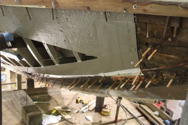 By early November, the project was progressing well. Though the task was immense, it was being tackled on many fronts. The only sticking point was the steel work. A number of companies had been approached, however, many seemed to be shying away from perhaps the more difficult details of the spec., which, in many places required for the hot works to take place with the timber planking in tact! Where access could be provided to the steel from both sides it would be however there are many places on the hull where this access was not available and would require a careful and skillful welder. The other difficulty was how to manufacture the keel plate/vertical keel plate angle. This length of angle steel joins the keel plate to vertical keel plate, originally by riveting. This piece has a slight change in bevel angle as it moves forward/aft over the frames along the centerline. We had initially hoped this piece could be manufactured by rolling however with change in bevel this proved inefficient and after a number of attempts we changed to manufacturing in-situ by welding. After struggling with this process through December, we found a fantastic team of welders within Burgess marine who in January started to find their rhythm.