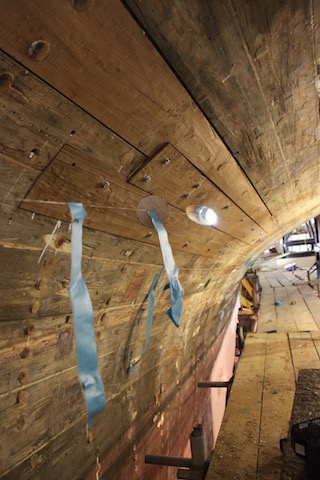 Nb – even though the list continued to evolve through the project we did have enough stock in the end with one teak board remaining and ¾ of a mahogany board. One of the most impressive facts was that not one plank was broken during reinstating. This tells the quality of the timber and the skill of the shipwrights. Many of these planks were in tight places, which not only incorporated bend, but twist as well. Areas around the sternpost were full of shape. None of the planks were steamed; they were gently (!!) coaxed into position with wedges and clamps sometimes over a couple of days before a large persuader was used to drive them home.