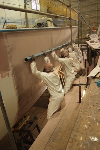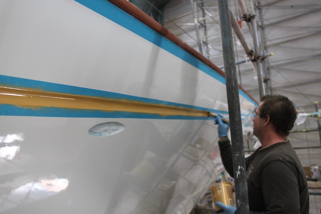 Cambria was now like a rolling factory line, we were chasing each other’s work from bow to stern. After each section was planed and sanded, it was then; sheathed, painted and faired. Once the whole hull was faired with the pink Awlfair, we could then start the hull painting.