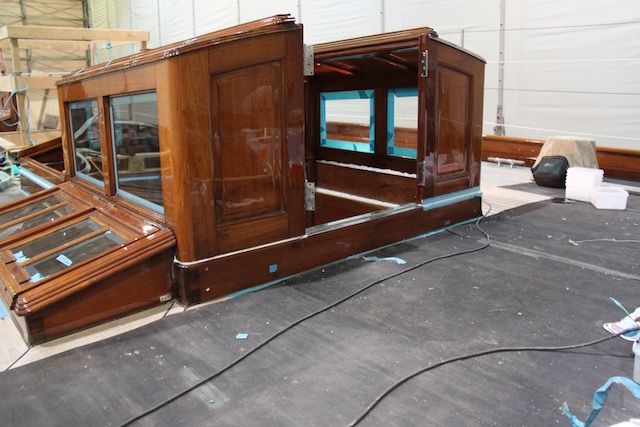 A program was drawn up and then the task of “stripping” commenced. After trying numerous methods, the guys settled on using; paint stripper, scrapers followed by sanding, brass wire brushes, steel wool and scouring pads for the mouldings and tricky to get to places. Long days of BBC Radio 2 Pop Master, Bluegrass sessions and talk back radio (Jeremy Vine!) ensued for the next 3 months as the mahogany was brought back to original deep red colour. The program included stripping, sanding, repairs where required (including major works to the main dog house and crew hatches to reduce water ingress) sealing coats, 8 coats of wood finish as build up followed by 2 coats minimum for top coats. Using the wood finish saved time and work by hot coating 4 coats at a time. It was an unknown to see what the final colour of the beautiful Brazillian mahogany would be. On each visit to the shed it was exciting to see the wood coming back to life after many years of sun bleach.