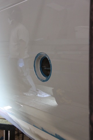 Friday the 25th , after the yard team had left, was our first top coat day. The 545 primer had been sanded back with 280 grit, the waterline taped on, and the shed cleaned in readiness. Two three-person teams took two hours to complete the first coat; one tack ragging and spotting, one rolling and one tipping. Saturday we sanded with 320 grit and then Sunday we applied the final coat.