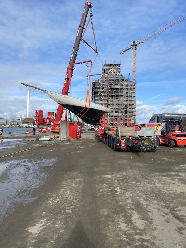 SKAKS arrived on the dock adjacent to Cambria on the morning of the 11th of October. The weather looked good for the mast and boom to be lifted onto trolleys on the 12th and provisionally it looked good for Monday and lifting Cambria. Dave and Jean-Mich had done a great job and the mast slid out perfectly and safely laid onto the custom-made trolleys. With mast out it could now be stripped of all standing rigging and spreaders. The mast had to wait for Cambria to go into the shed first so once stripped of rigging we pushed it down the dock to make way for the heavy lift crane to pick up Cambria.